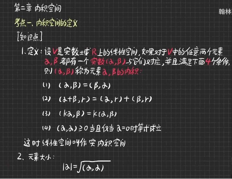 内积可以看作是两个向量之间的“相似度”或“夹角”。内积空间具有许多重要的性质,包括范德蒙恒等式、柯西-施瓦茨不等式和三角不等式等。内积空间是线性代数研究的重要分支,应用广泛,例如量子力学、信号处理、数值计算、图像处理等领域。