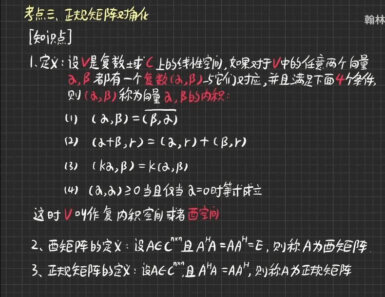 简单来说内积是对点积增加复数域的推广,内积空间就是酉空间。共轭转置是复数的概念: