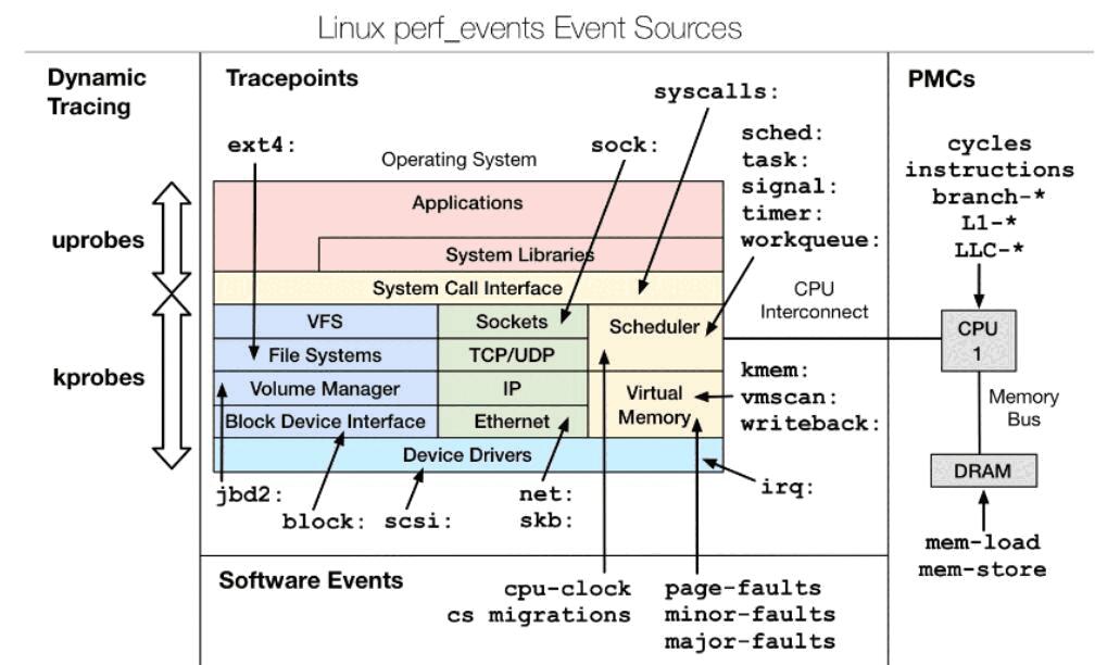 利用 CPU performance counters( 性能计数器 ) , tracepoints, kprobes 和 uprobes 来进行应用程序的性能分析。 perf 使用这些 linux 内核提供的 tracing 特性进行事件的采集和分析, perf 使用的 event 主要有以下几种: