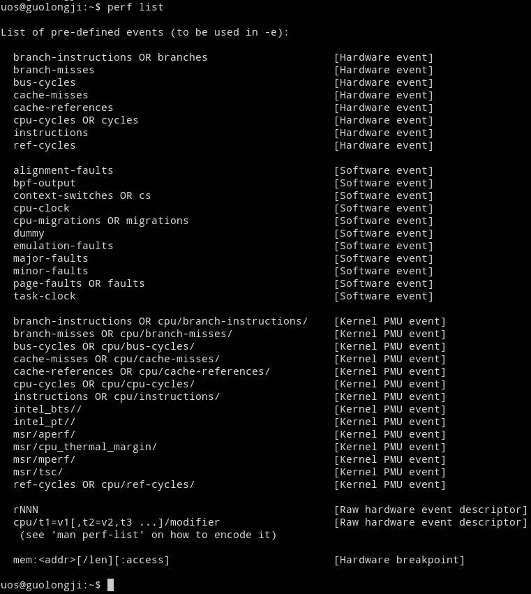 | 11 | list | 列出当前系统支持的所有性能事件。包括硬件性能事件、软件性能事件以及检查点。 |